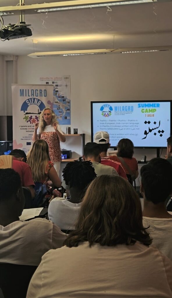 The week began with “Language Challenges”, where Pakistani and Italian volunteers guided participants through Pashto, Urdu, and other languages. Special emphasis was placed on Pashto, as it is the primary language of most migrants participating in the MILAGRO project. What started as a learning exercise soon became a source of amusement: people were thrilled to copy the Pashto alphabet and burst out laughing as they proudly compared their attempts at